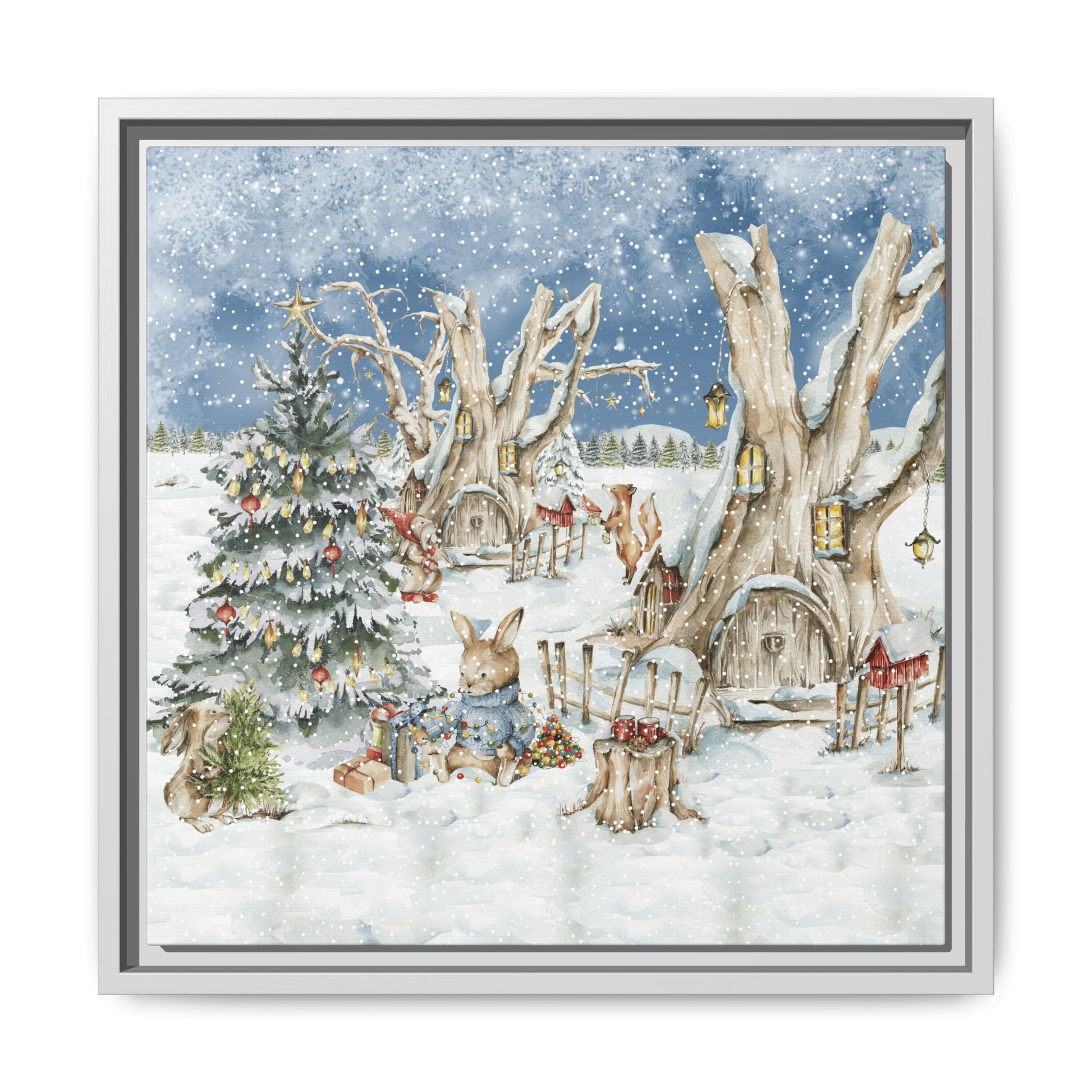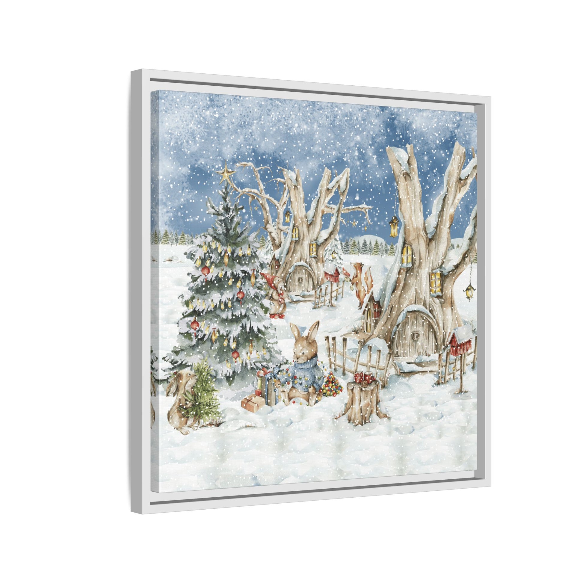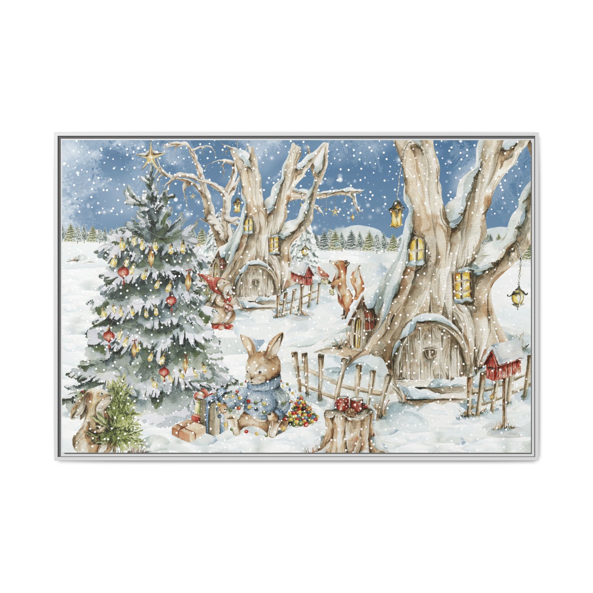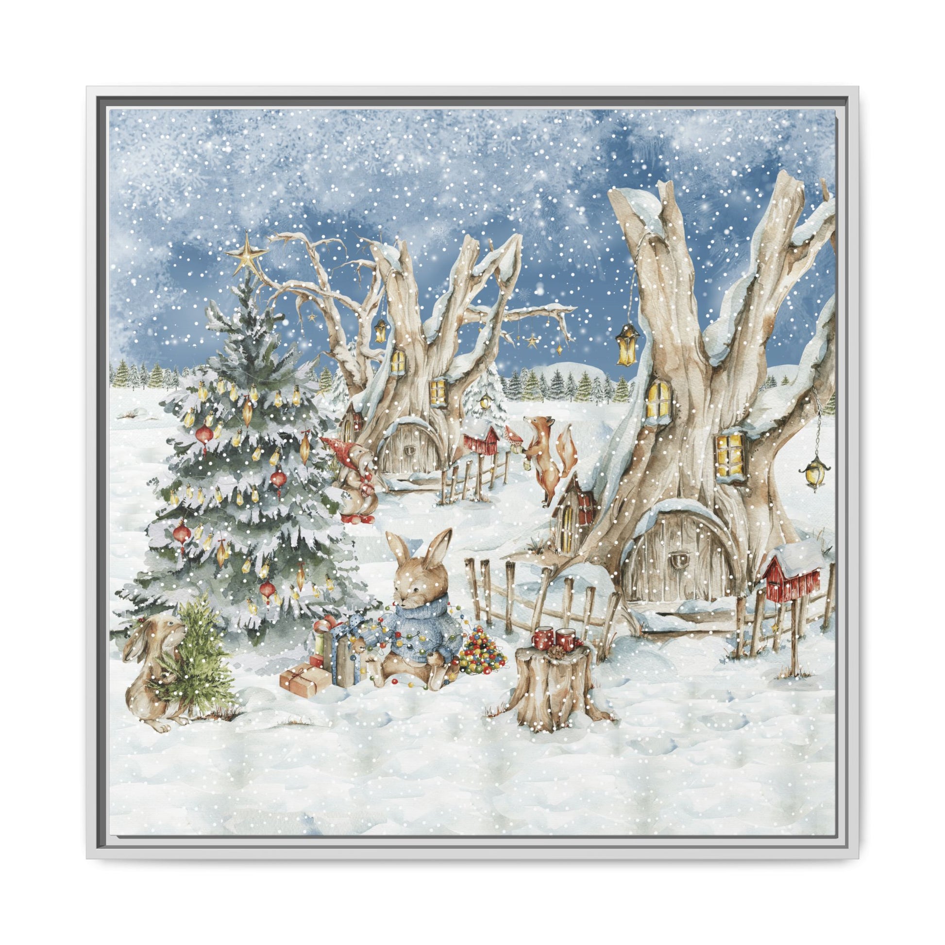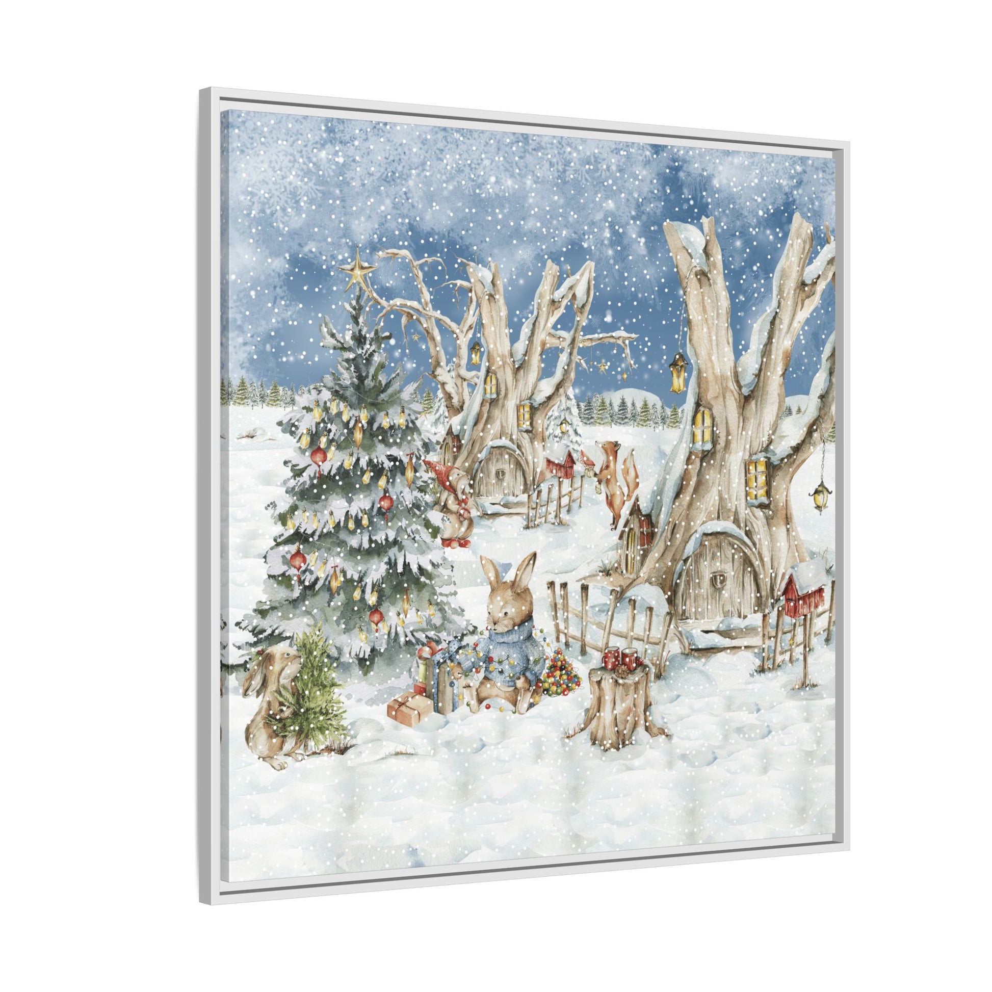 In the foreground, the other little treehouse hosts an enchanting scene: two adorable rabbits are busy decorating a tall green Christmas tree. The tree is only half-finished, as one rabbit untangles a shimmering string of Christmas lights, while the other holds a baby sapling in its paws. Nearby, wrapped gifts sit waiting to be placed under the tree, and beside them, a tree trunk offers a cozy resting spot complete with red cups and biscuits—perfect for the little workers to warm up as they continue their festive task. This peaceful, joyful scene captures the essence of the holidays, where families come together to decorate their tree and prepare for the festive season, even in the heart of winter.