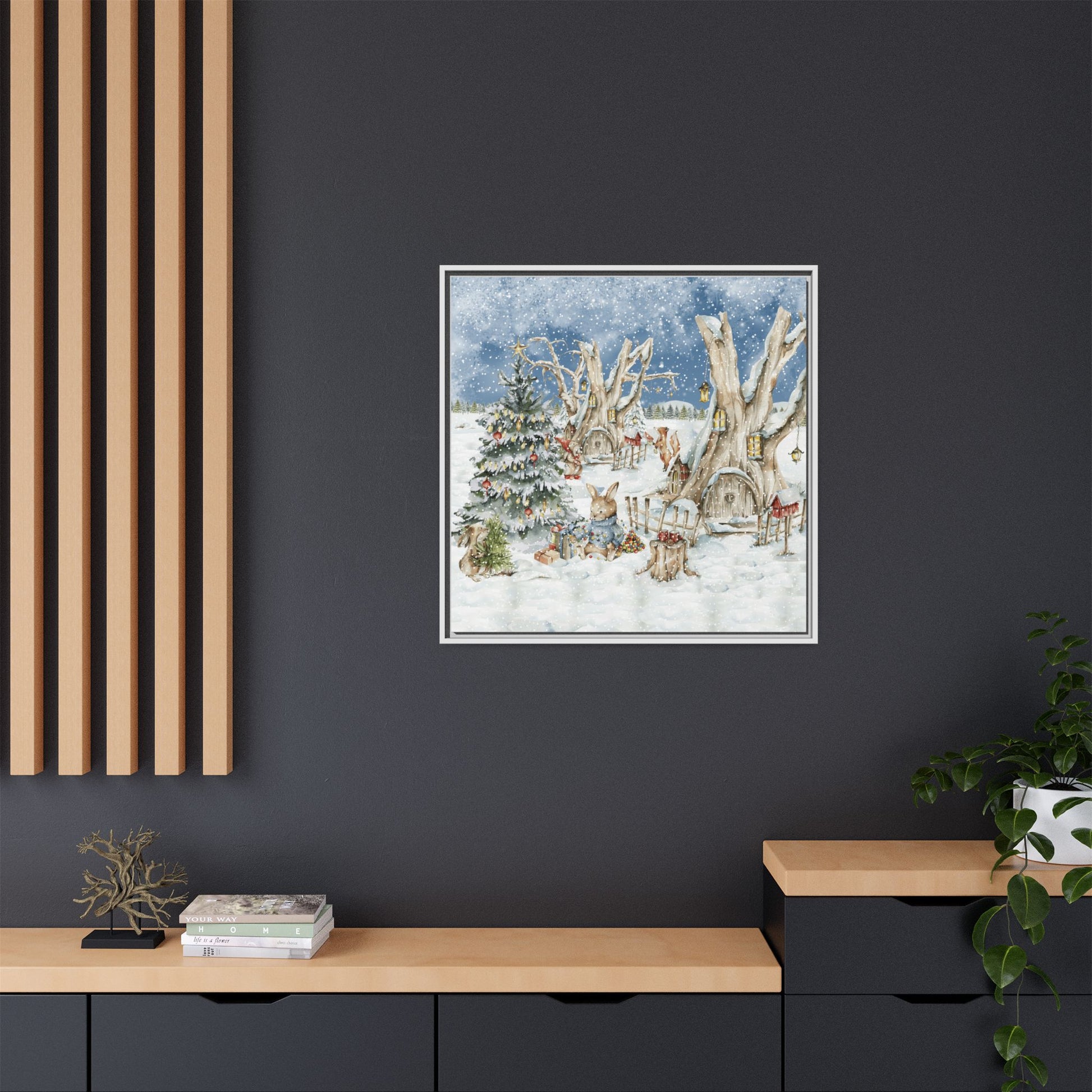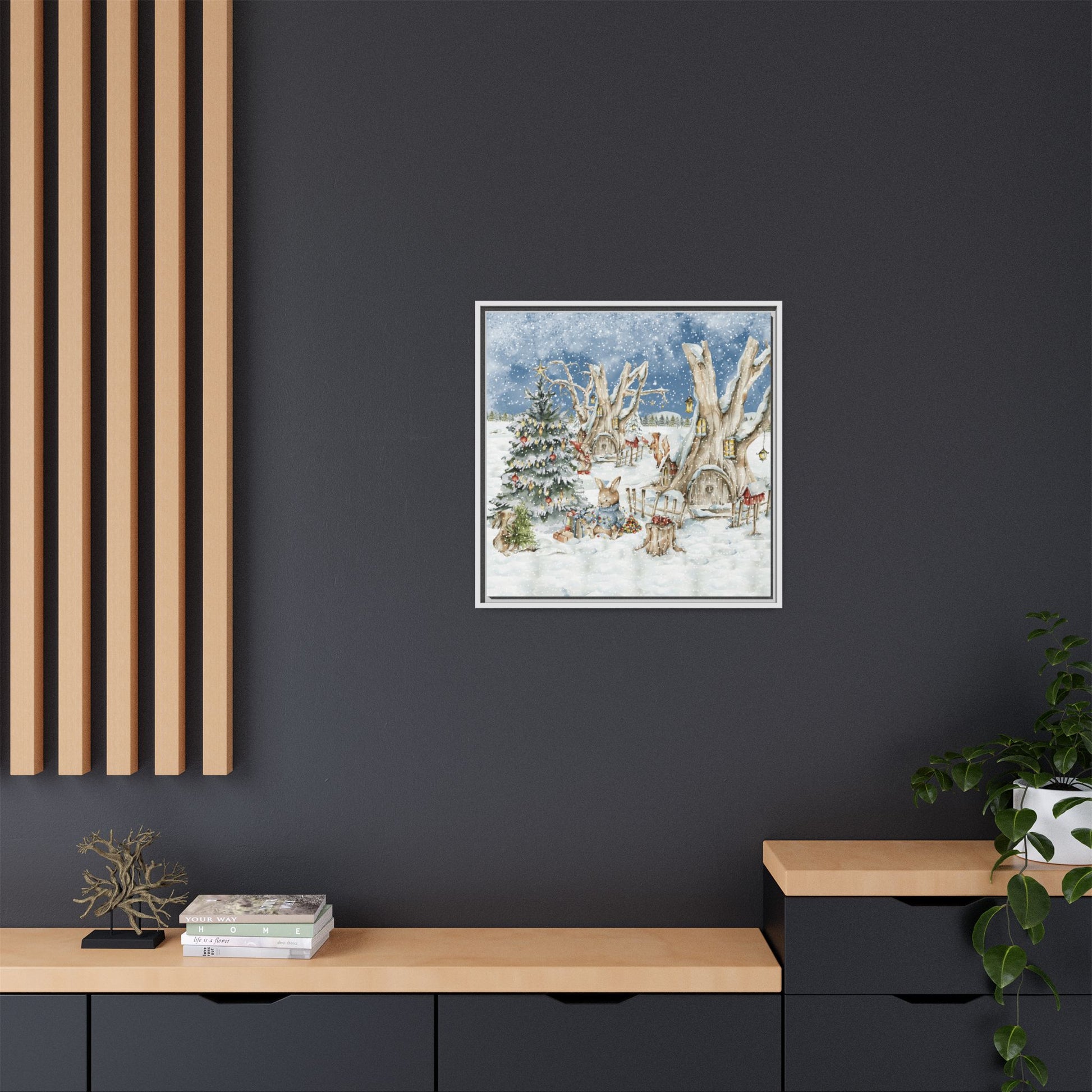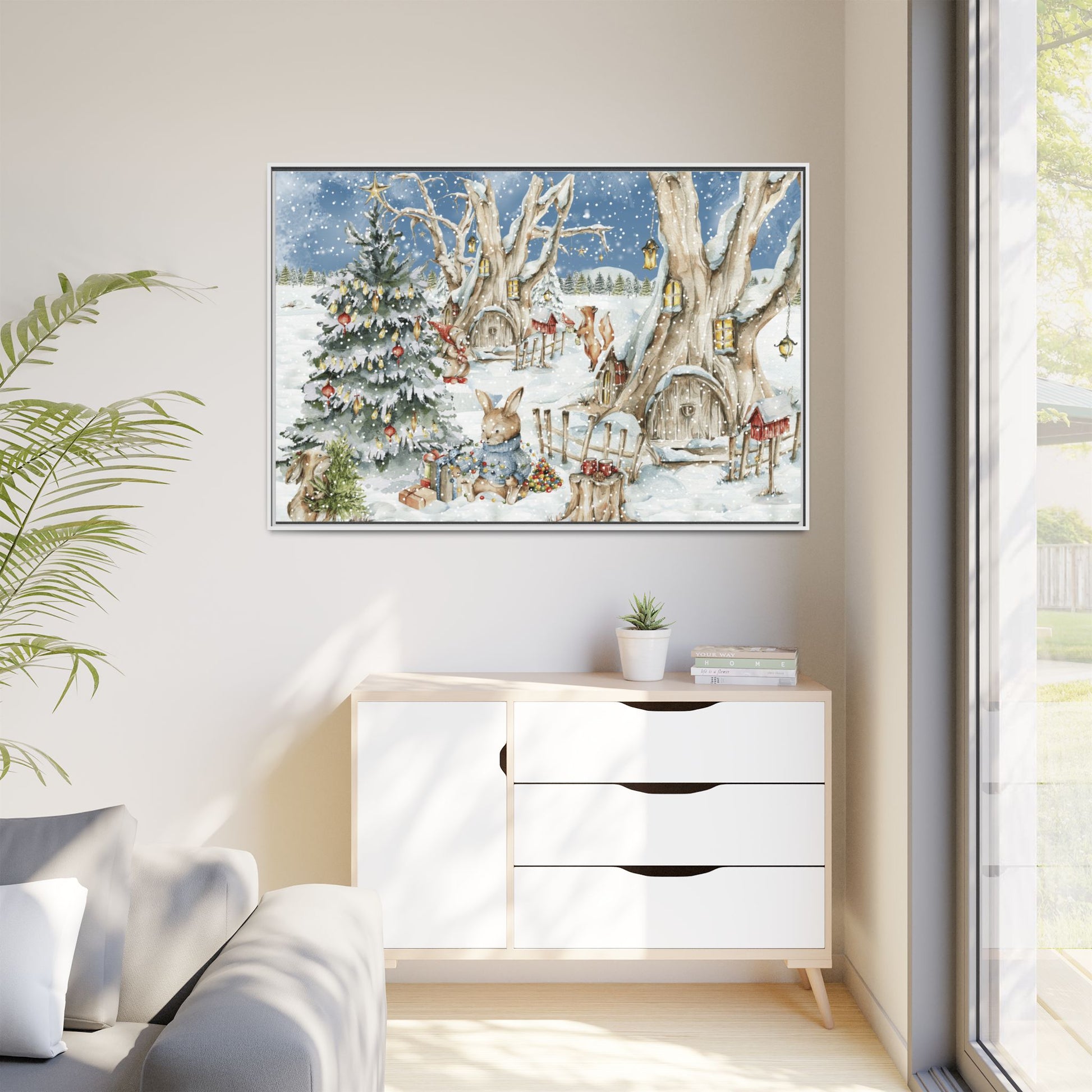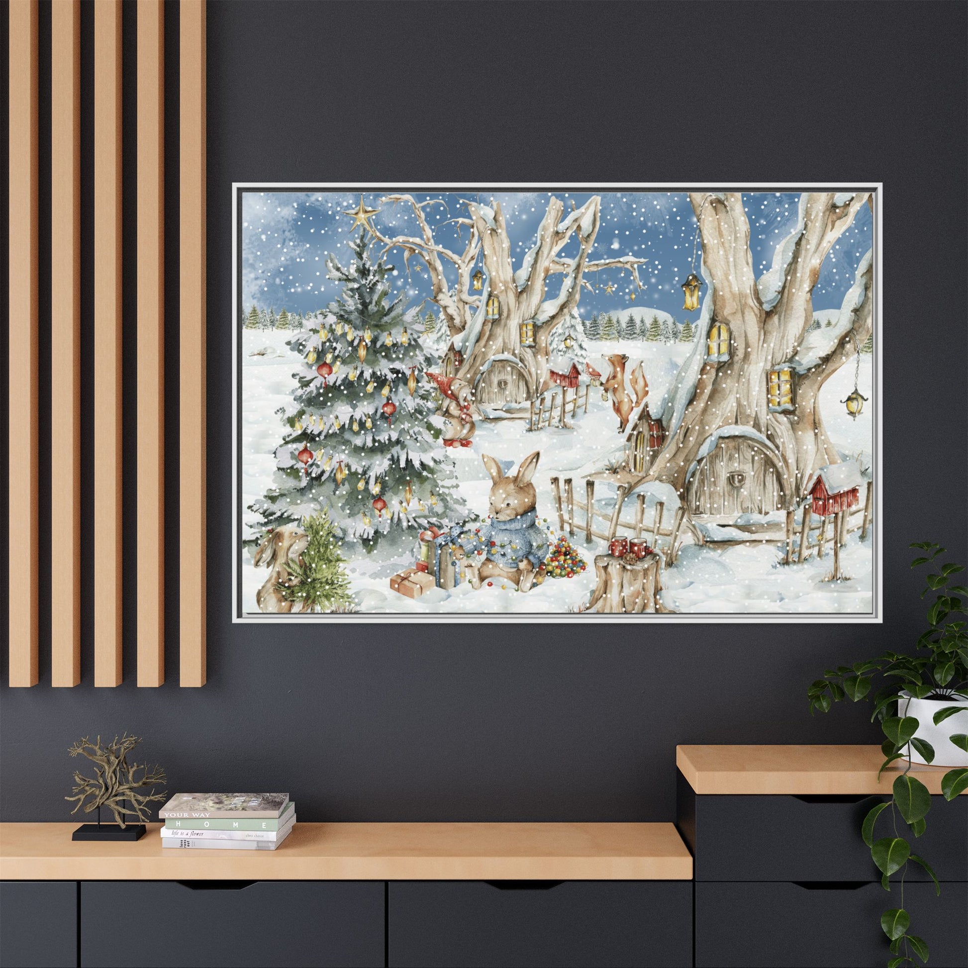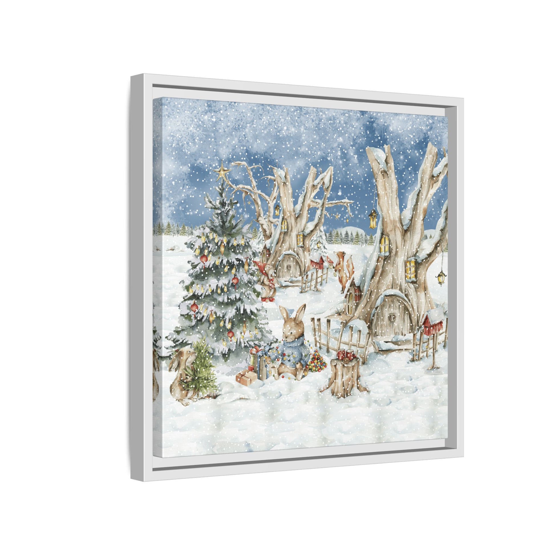 In the foreground, the other little treehouse hosts an enchanting scene: two adorable rabbits are busy decorating a tall green Christmas tree. The tree is only half-finished, as one rabbit untangles a shimmering string of Christmas lights, while the other holds a baby sapling in its paws. Nearby, wrapped gifts sit waiting to be placed under the tree, and beside them, a tree trunk offers a cozy resting spot complete with red cups and biscuits—perfect for the little workers to warm up as they continue their festive task. This peaceful, joyful scene captures the essence of the holidays, where families come together to decorate their tree and prepare for the festive season, even in the heart of winter.