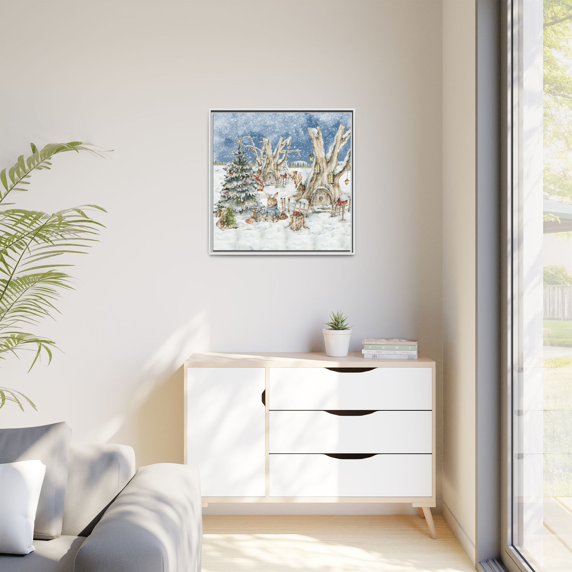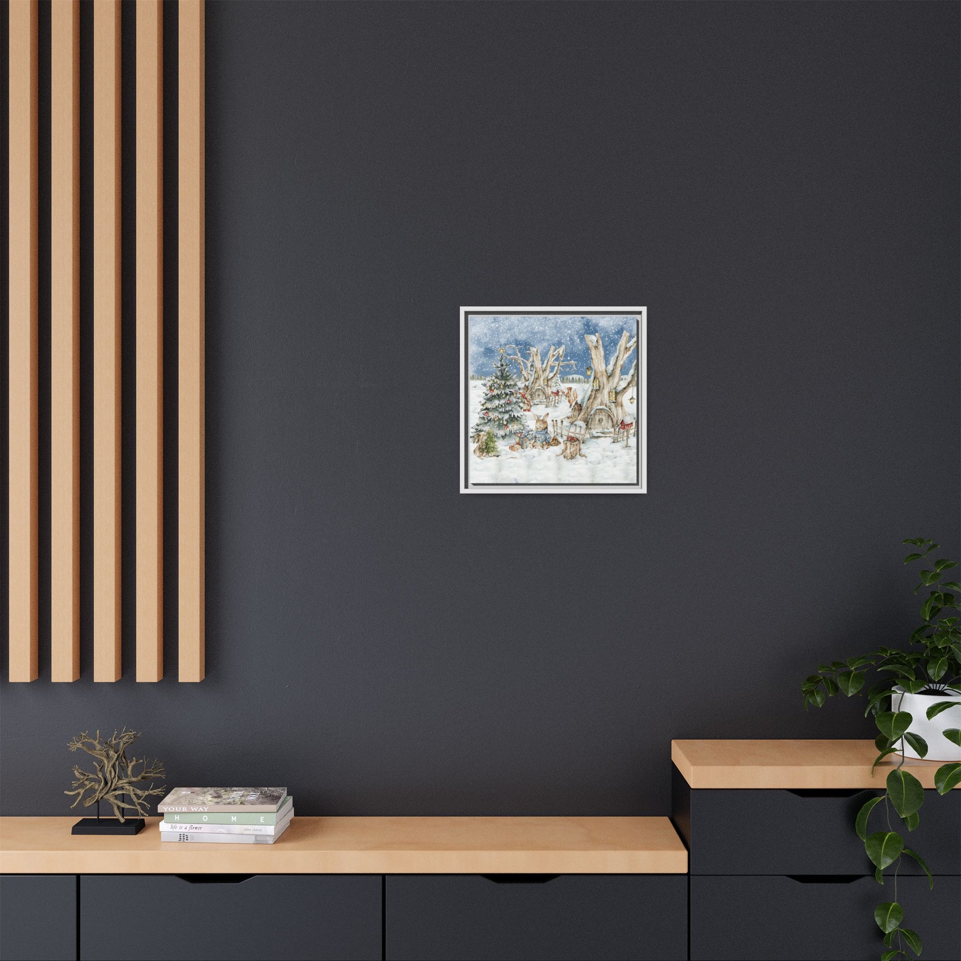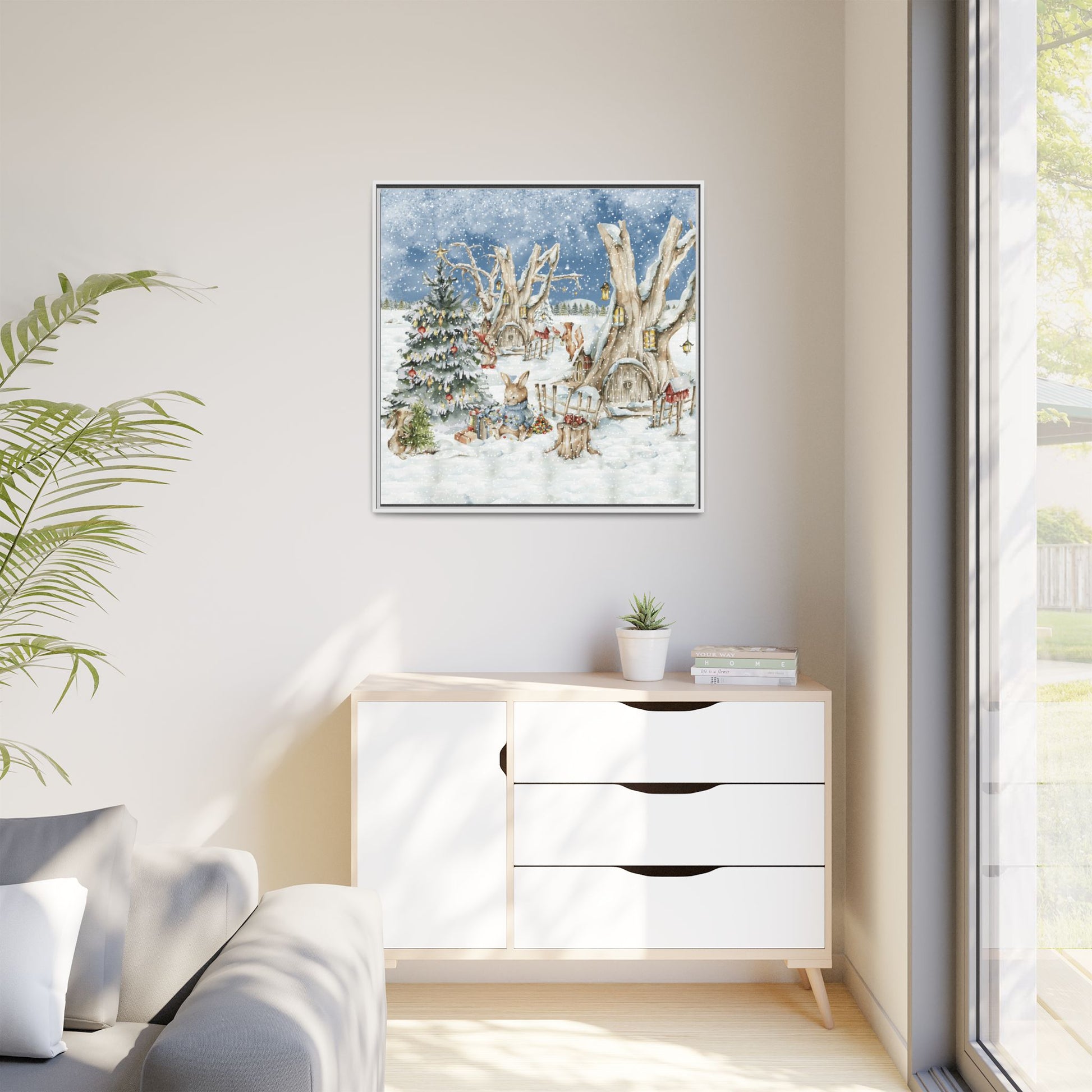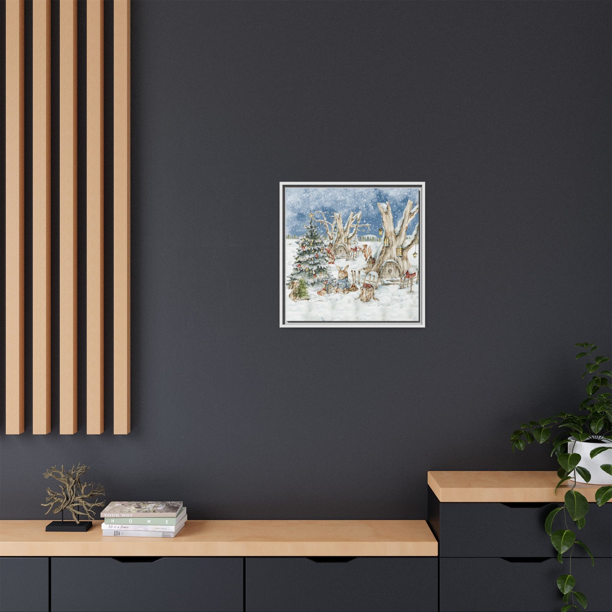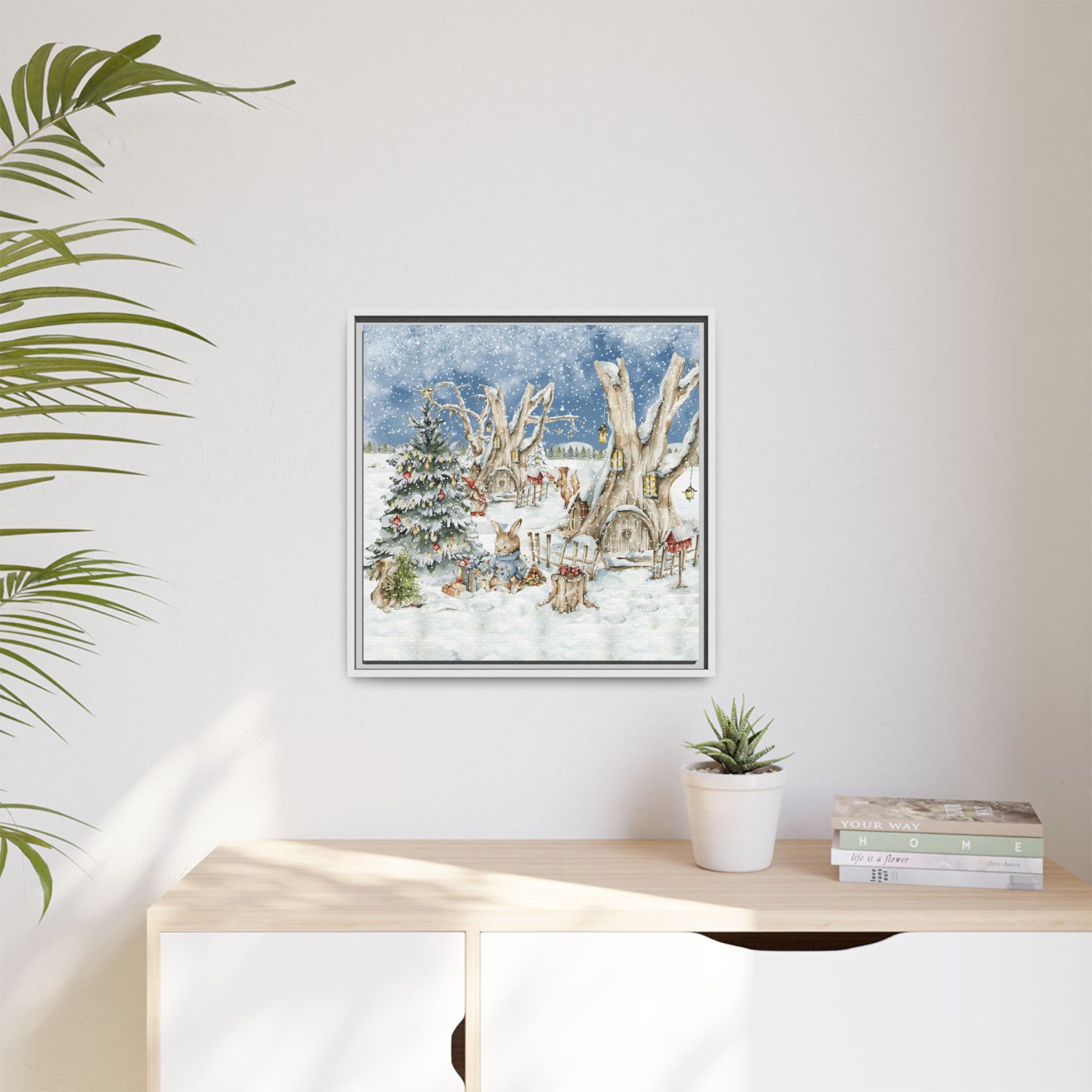 In the foreground, the other little treehouse hosts an enchanting scene: two adorable rabbits are busy decorating a tall green Christmas tree. The tree is only half-finished, as one rabbit untangles a shimmering string of Christmas lights, while the other holds a baby sapling in its paws. Nearby, wrapped gifts sit waiting to be placed under the tree, and beside them, a tree trunk offers a cozy resting spot complete with red cups and biscuits—perfect for the little workers to warm up as they continue their festive task. This peaceful, joyful scene captures the essence of the holidays, where families come together to decorate their tree and prepare for the festive season, even in the heart of winter.
