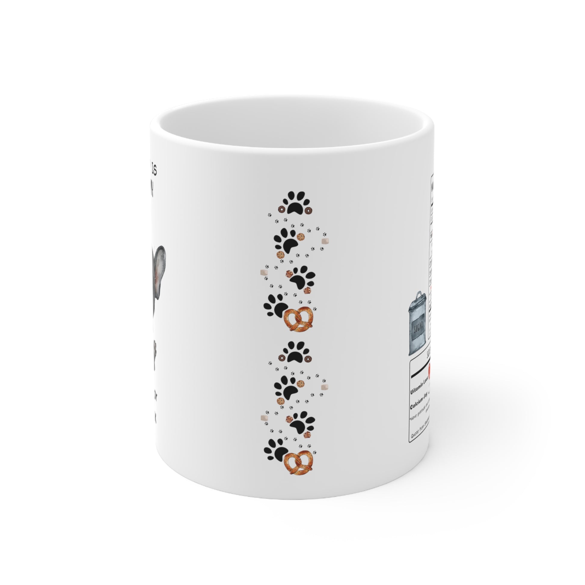 For dog lovers, we have created a mug that is simply original. With a funny nutrition label on the right side of the cup and a cute French Bulldog Gray hair on the left side of the cup, you'll be thrilled to walk around with your new cup of coffee-tea-milk-hot chocolate at work at home and even taking it out of your backpack at school. This little jewel of 11 ounce can also be offered as a gift for your loved one.